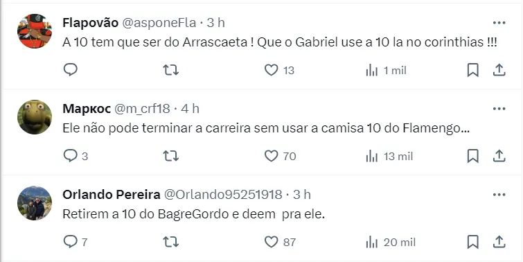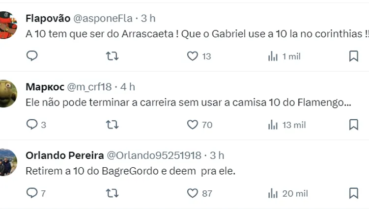 Arrascaeta ainda revelou que com a saída de Diego Ribas, que se aposentou dos gramados, já havia ficado acordado que Gabigol herdaria o número. Ele aponta que mesmo a diretoria tendo feito a promessa e sabendo do interesse, ele não foi comunicado. Mas, diante de tudo que o Gabi fez, fica difícil tirar o número dele.