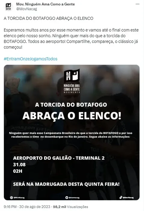 Porém, diferente do que a Nação está assistindo no cotidiano recente, com protestos no aniversário de Gabigol por exemplo, os adeptos do Botafogo abraçaram o time. Um movimento de alvinegros decidiu se reunir nas redes sociais para prestar apoio ao time na briga pelo tão sonhado Campeonato Brasileiro. De olho no título definitivo, o Clube de General Severiano já sabe o que fazer.