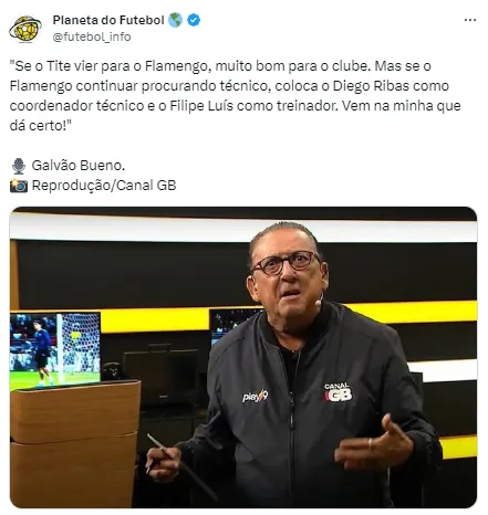 “Se o Tite vier para o Flamengo, muito bom para o clube. Mas se o Flamengo continuar procurando técnico, coloca o Diego Ribas como coordenador técnico e o Filipe Luís como treinador. Vem na minha que dá certo!”, afirmou Galvão Bueno sobre o novo comandante do Rubro-Negro Carioca.