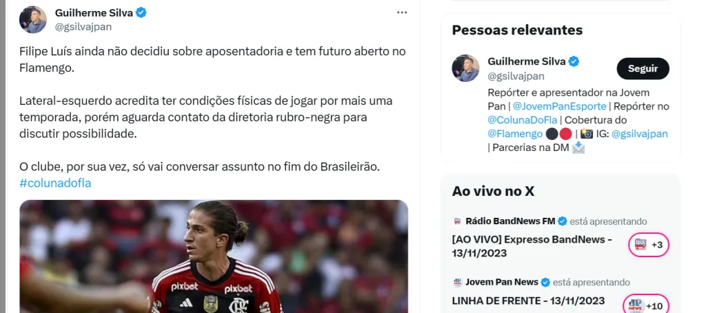 E para quem crê que o lateral de 38 anos já optou pela aposentadoria, se enganou. A reportagem informa que FL considera estar apto fisicamente para atuar em 2024 pelo Mais Querido.