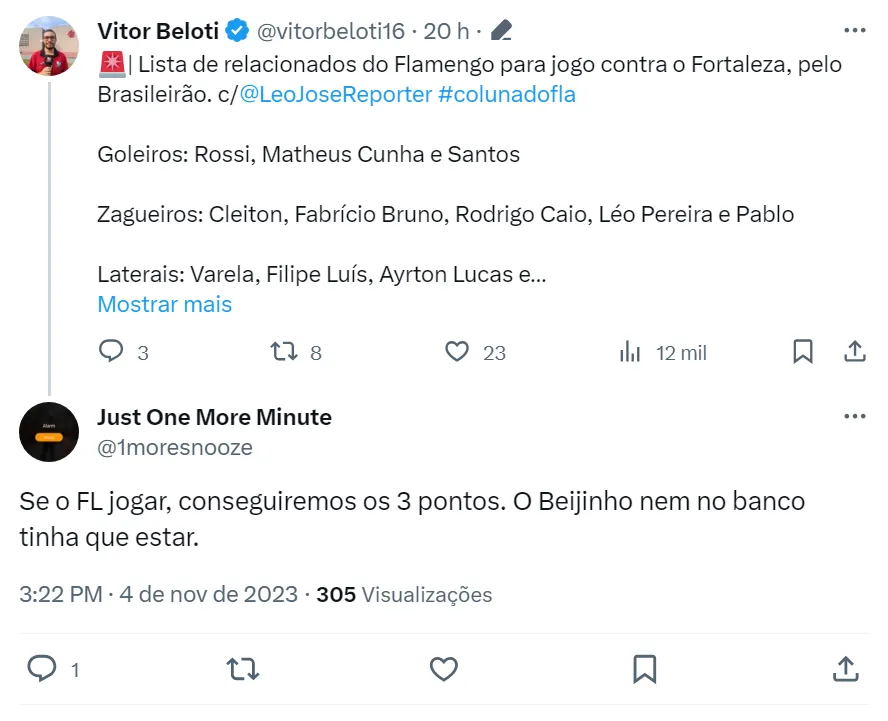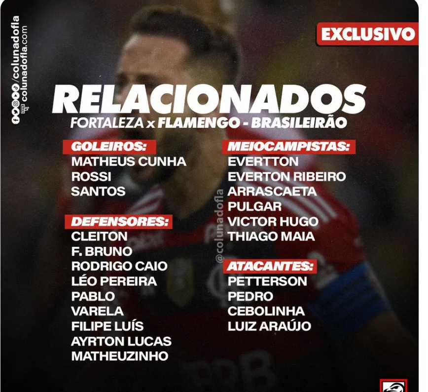 Com o Clube da Gávea bastante desfalcado, a Coluna do Flamengo informou os jogadores que viajaram para Fortaleza e Tite relacionou o jovem Petterson Novaes para a partida contra o Fortaleza.