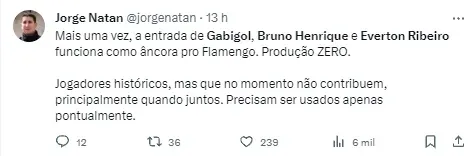 “Bruno Henrique e Gabigol saindo do banco foram menos úteis do que Lelê e Yony Gonzalez. BH fez boa temporada e entrou em má fase, é possível entender (SIC)”, comentou o jornalista em sua rede social no Twitter.
