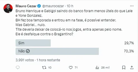 “Mas Gabriel… nulo. Tite deveria deixar de colocá-lo nos jogos, entra apenas pelo nome. Ele é desfalque contra o Bragantino?”, questionou Mauro Cezar Pereira, com direito a enquete indicando que a torcida concorda com ele.