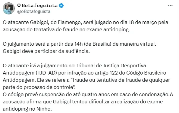 Em um dos relatos da denúncia, é dito que Gabigol demorou para realizar o exame antidoping e se recusou a cumprir algumas instruções. Com exceção do atacante, todos os atletas do clube fizeram corretamente o exame do dia 8 de abril de 2023.