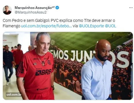 “O Tite pode fazer outra formação, completamente diferente, mas ele tem partido do 4-1-4-1. Então, imagino que ele faça uma linha de quatro; Pulgar ou Thiago Maia; Everton Ribeiro, De Arrascaeta, Gerson e Bruno Henrique; Pedro na frente. Por que Pedro na frente? Porque o Pedro é centroavante de fazer pivô, de fazer o time chegar, de fazer a parede, esperar o Arrascaeta entrar, esperar o Bruno Henrique se infiltrar, fazer a preparação e também virar para dentro do gol”, projetou PVC.