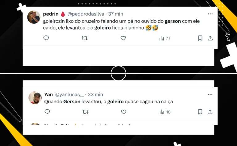 “Jurei que o Gerson ia amassar o goleiro”, comentou outro torcedor do Mengão em seguida. “Quando Gerson levantou, o goleiro quase cagou na calça”, ironizou mais um torcedor flamenguista.