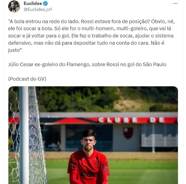 “Não foi um erro de Rossi. Getúlio, quantas vezes você socou a bola ali no ‘bololô’ e a bola foi para frente. Às vezes você não consegue executar o movimento correto. Você tem que fazer naquele momento ali, fazer o movimento que permite ser feito”, iniciou Júlio César, ex-goleiro do Flamengo, sobre gol sofrido por Rossi contra o São Paulo ao Podcast do GV.