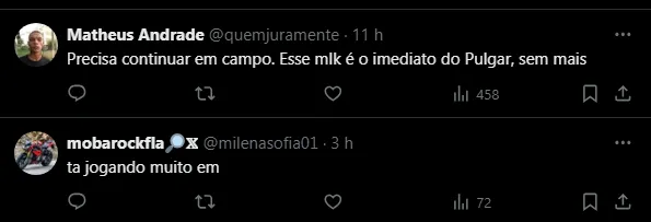 “Fico feliz. Agradeço a todos pelo carinho e apoio que tenho recebido. Nunca tive muito contato com o João Gomes, mas é um cara também em quem eu me inspiro bastante. Ele teve bastante tranquilidade aqui no Flamengo, na questão da transição de dar o passo para o profissional, aproveitou as oportunidades e fez muita história. Acredito que eu possa trabalhar bastante para chegar no auge onde ele está”, disse o atleta.
