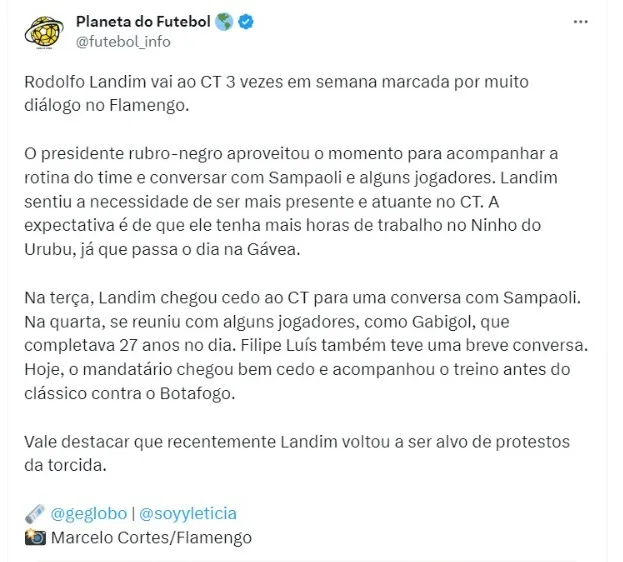 Para fechar a semana, o presidente esteve no CT bem cedo na manhã desta sexta-feira (1), e acompanhou as atividades: “Landim sentiu a necessidade de se fazer presente e ser mais atuante nos aspectos administrativos do CT. A expectativa é de que ele tenha mais horas de trabalho no Ninho do Urubu”, diz um trecho da matéria do GE.