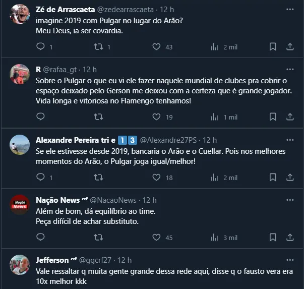 Dito isso, o torcedor rubro-negro também vem se derretendo por Pulgar, que já parece ter caído nas graças da torcida. Por fim, ele também soma 75% de aproveitamento no Brasileirão quando está em campo.