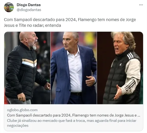 De acordo com informações do jornalista Diogo Dantas, do O Globo, o Flamengo já sinalizou ao mercado que contratará um novo técnico para o lugar de Sampaoli em 2024. Jorge Jesus e Tite são os alvos da diretoria. O argentino não vai continuar no Rubro-Negro.