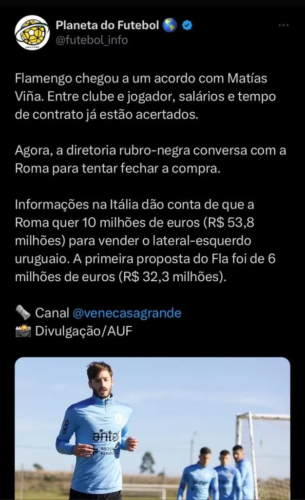 Ainda segundo o comunicador, apesar do alto valor, entre o jogador e o Clube está tudo acertado, principalmente salário e tempo de contratação, ele de fato quer vestir a camisa do Flamengo.