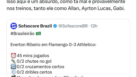 E com o momento conturbado, o elenco também passa por situações adversas. Éverton Ribeiro, peça importante da equipe de Sampaoli, não foi nada elogiado pela torcida. O jogador participou de 45 minutos, sem chutes ao gol, não acertou duas tentativas de cruzamentos, não acertou dribles, e perdeu 11 posse de bola de 38 ações, além do pênalti cometido, segundo números do Sofascore.