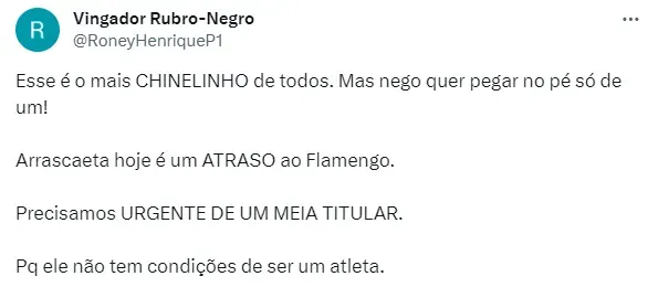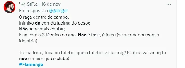 “Jogadores devem procurar psicólogos, como qualquer um de nós. Só ajuda e se o clube não oferece, isso não pode impedir tal iniciativa. Mas é absurdo que um integrante de primeira divisão como o Flamengo não conte com um profissional da área no seu dia a dia”, disse em seu Twitter.