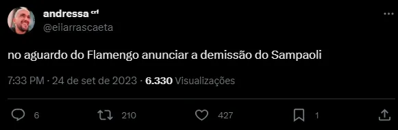Segundo o jornalista, a saída de Sampaoli deve ser confirmada entre este domingo (24) e a segunda-feira (25). “Não vai demorar”, disse Mauro Cezar. Ou seja, é bem provável que o Flamengo termine a temporada sem o argentino comandando a equipe do banco de reservas. Em 39 jogos, foram 20 vitórias, 11 empates e oito derrotas.