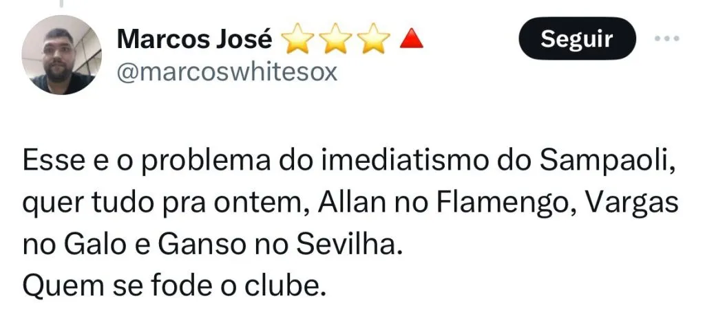 O Fla entende que trocou muito de técnico. Ao todo, o Mengão teve 3 treinadores na temporada: Vitor Pereira, Sampaoli e Tite. Do trio, apenas Tite teve o carinho da torcida desde que chegou. As contratações também foram contestadas.