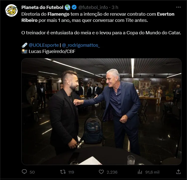 Vale destacar, inicialmente, que o Flamengo tinha como objetivo estender o vínculo por mais uma temporada. Mas a questão salarial ainda é um problema para a gestão. A expectativa é que Tite sinalize de maneira positiva, visto que Everton Ribeiro foi convocado para a Copa do Mundo de 2022 pelo comandante. Além de ter um estilo de jogo que interessa o novo técnico ter no elenco para a próxima temporada.
