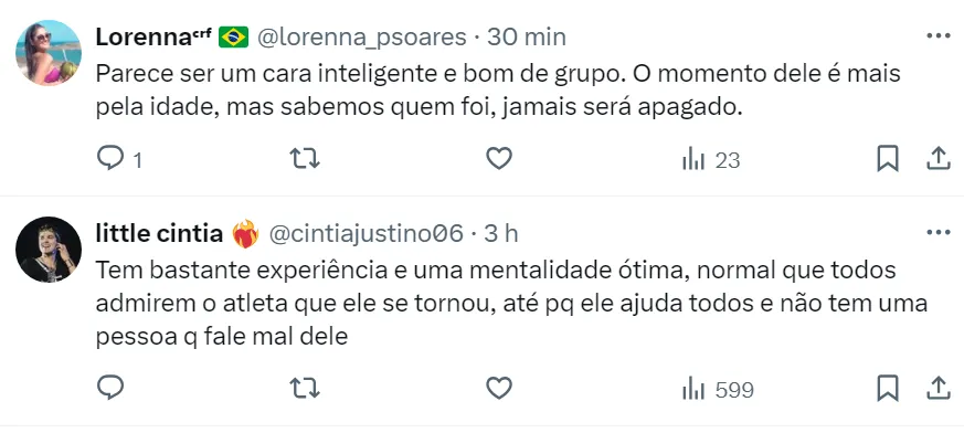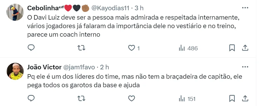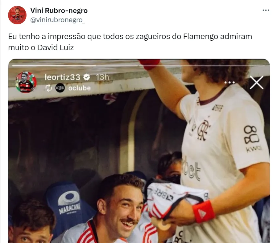 No X (antigo Twitter), a postagem de Léo Ortiz rendeu elogios para David Luiz, que atualmente é reserva no time de Tite. O experiente jogador atualmente tem um papel mais importante fora de campo e é um dos líderes do elenco.