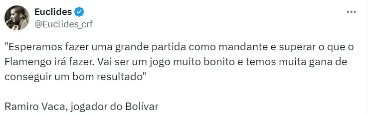 Assim como Ramiro Vaca, Saucedo concordo com o colega e também teceu elogios ao Flamengo. Porém, o jogador se mostrou confiante na vitória do Bolívar.