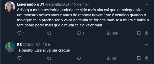 Afinal, mesmo sem sequer ter um longo histórico no Orgulho da Nação, a diretoria comandada por Rodolfo Landim estipulou uma multa rescisória de 50 milhões de euros (cerca de R$ 271 milhões). Em suas redes sociais, o garoto postou a seguinte mensagem: