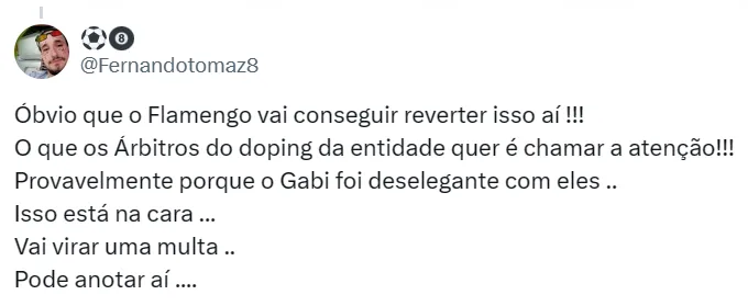 “A tentativa de fraudar o exame antidoping é, em si mesma, a confissão de que temia pelo resultado, o que talvez explique o fato de o jogador ter enveredado pela vida artística e se transformar no Lil Gabi”, disse.