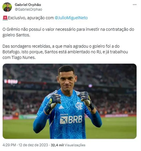Outro fator que deixa o Botafogo ainda mais próximo de contratar Santos, é o fato de o Grêmio não ter as condições financeiras necessárias para concorrer pelo goleiro. Além disso, o fato de Tiago Nunes, técnico do rival do Mengão, ter pedido a contratação é um trunfo para a decisão do goleiro.
