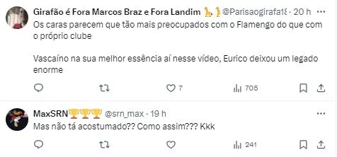 “É uma mancha na história do Vasco. É um exagero? Para mim, não é. Eu não estou acostumado com isso. Como não estou acostumado a jogar 26 vezes contra o Flamengo e ganhar apenas duas. E tem que aturar um monte me ‘mimizeiro’ falando e vou falar de novo. Falo de novo. Recorta e bota aí. Freguês de caderno! Nem na final contra eles a gente consegue chegar. Então, para de cagar regra, vem para a realidade, senta aqui do ladinho”, disparou o narrador vascaíno.