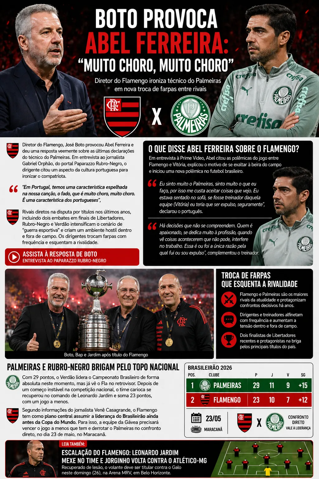Diretor esportivo do Flamengo, José Boto provocou Abel Ferreira e deu uma resposta veemente sobre as últimas declarações do técnico do Palmeiras. Em entrevista ao jornalista Gabriel Orphão, do portal Paparazzo Rubro-Negro, o dirigente citou um aspecto da cultura portuguesa para ironizar o compatriota.