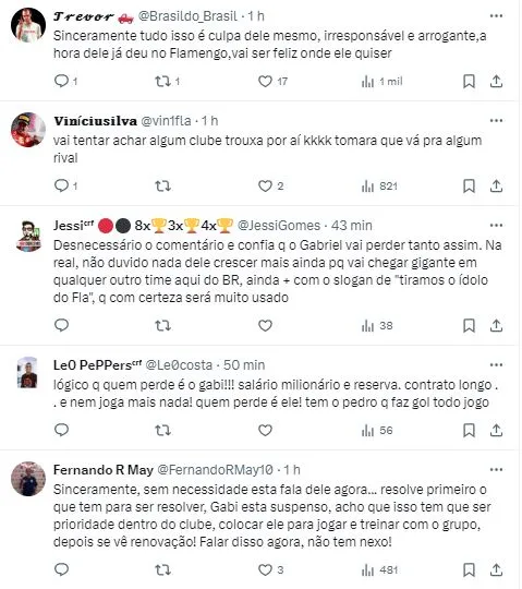 Porém, segundo apuração da jornalista Raisa Simplício, do portal Goal, o presidente do Mais Querido, Rodolfo Landim, confidenciou a aliados nos bastidores da Gávea, seus olhares sobre uma possível saída de Gabriel do Mengão.