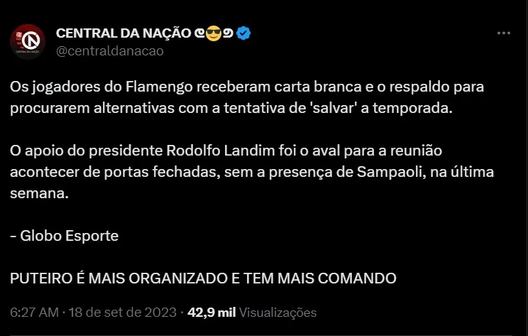 E, após uma festa linda da torcida no Maracanã, a equipe comandada por Sampaoli não conseguiu apresentar um desempenho minimamente contundente e saiu atrás na busca pelo título da Copa do Brasil. Por conta disso, de acordo com informações do portal GE, os jogadores do Flamengo receberam cartão branca e respaldo da diretoria para buscarem alternativas para ‘salvar’ a equipe na temporada.