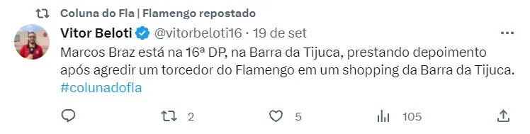 Com um shopping inteiro mobilizado ao redor da loja em que Marcos Braz estava, o dirigente foi conduzido pela polícia até a delegacia mais próxima do local. O caso ganhará os relatos de cada parte e devem ser julgados pelas autoridades cariocas. Ao deixar o shopping, Braz foi bastante xingado pelos torcedores do Rubro-Negro, que gritavam frases como “o meu Flamengo não precisa de você” e outras provocações de baixo calão.