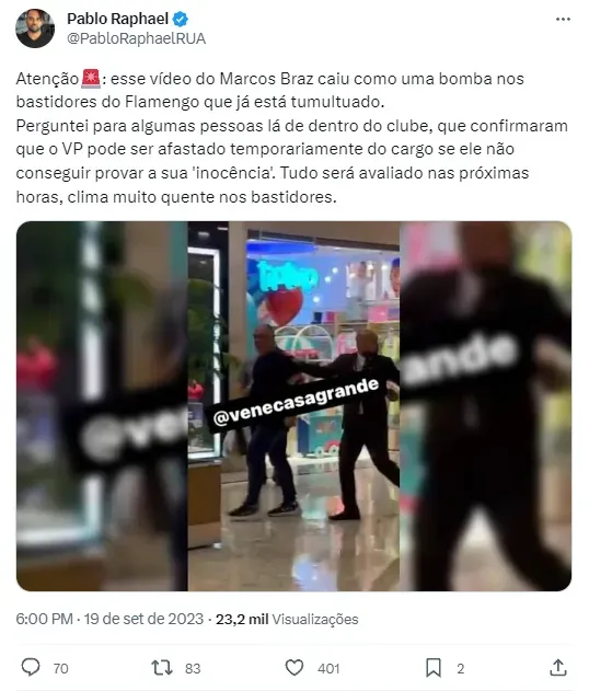 O Flamengo pode afastar temporariamente o vice-presidente de futebol Marcos Braz caso não seja comprovada sua inocência no caso. Segundo o jornalista Pablo Raphael, pessoas de dentro do Clube admitiram que o clima está quente internamente e que tudo será avaliado nas próximas horas. Parte da torcida do Rubro-Negro já vem pedindo a saída do dirigente há algum tempo, o que de fato só aconteceria agora, com um incidente melancólico.