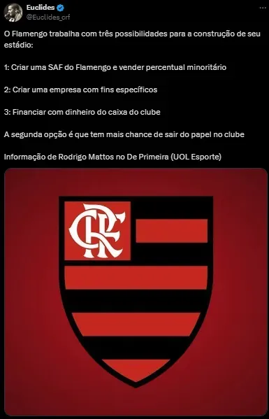 A ideia do Fla seria criar uma Sociedade Anônima do Futebol e negociar apenas um quarto das ações do Clube. Com isso, a equipe manteria a maior parte e seguiria como sócio majoritário. “O presidente Rodolfo Landim quer criar uma SAF do Flamengo, que venderia algo como 25% das ações do clube e pegaria esse dinheiro para financiar a construção do estádio”, disse o jornalista.