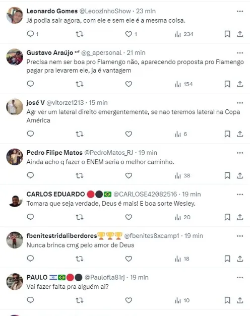 “Em contato com fonte ligada ao lateral direito Wesley, recebemos a informação que os agentes do jogador devem apresentar ao Flamengo uma proposta boa de clube da Europa pelo jogador para sair do Mais Querido no meio do ano. A fonte não revelou o clube, mas deixou claro que a proposta chegará e que será boa para o Mengão“, escreveu o Paparazzo Rubro-Negro.