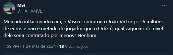 Só a título de comparação, o Vasco desembolsou 6 milhões de euros para tirar João Victor do Benfica (POR). Já Nino, ex-Fluminense, foi vendido por 5 milhões de euros para o Zenit (RUS). Isto é, valores bem próximos.
