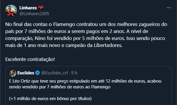 Dito isso, em relação ao custo, o vale frisar que, de acordo com as informações noticiadas nesta sexta-feira (1), Léo custará cerca de 7 milhões de euros aos cofres rubro-negros, com o valor podendo alcançar 8 milhões em caso de títulos.