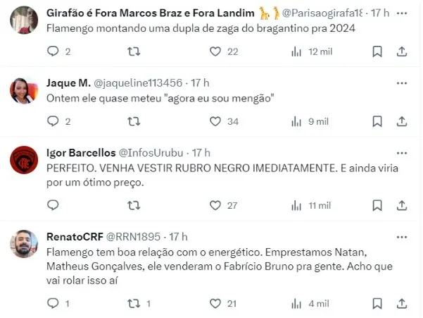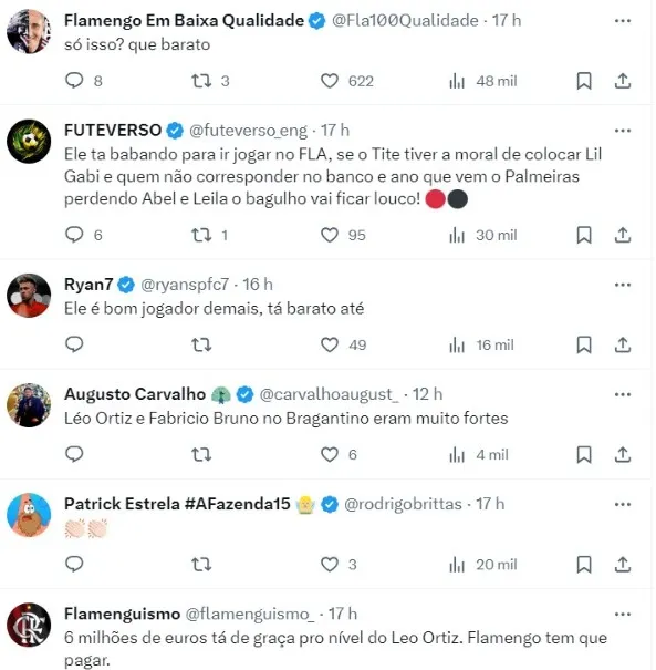 O Bragantino espera uma proposta de pelo menos R$ 35 milhões para fechar negócio e mesmo com o atleta tendo interesse, não vai abrir mão desse valor. Léo Ortiz é bem avaliado pela comissão técnica de Tite.