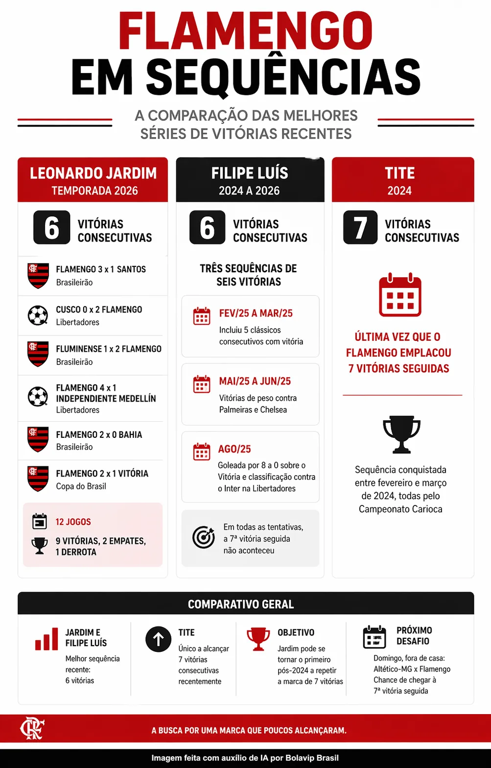 No domingo, fora de casa, diante do Atlético-MG, Leonardo Jardim terá a chance de ultrapassar Filipe Luís e alcançar sete vitórias consecutivas. A última vez que isso aconteceu foi com Tite, em 2024, quando o Flamengo embalou sete triunfos seguidos no Campeonato Carioca.