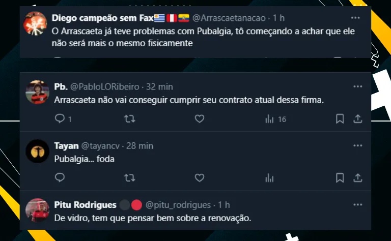 Por fim, de acordo com informações do repórter Raphael Sibilla, do SporTV, Arrascaeta havia se queixado de um desconforto na coxa direita, e, mesmo após o médico do Uruguai borrifar o spray na região, o jogador levou a mão à virilha minutos mais tarde e saiu. Confira a repercussão dos flamenguistas: