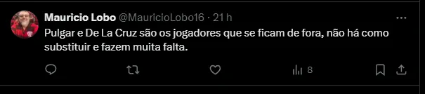 Dessa maneira, o meio-campista não está 100% confirmado para a partida. A decisão final será durante a semana, após mais sessões de atividades com os fisioterapeutas. Para o confronto do Campeonato Brasileiro, diante do Corinthians, a ausência é certa.