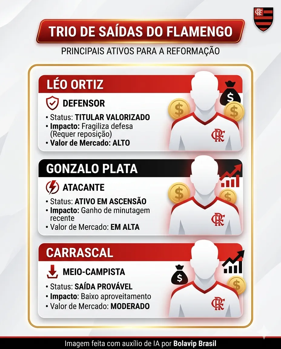 As informações repercutidas e trazidas pelo site FlamengoRJ, que cobre o Mengão, dá conta de que três jogadores podem deixar o time no meio da temporada. Os nomes da lista são: Léo Ortiz, Carrascal e Gonzalo Plata.