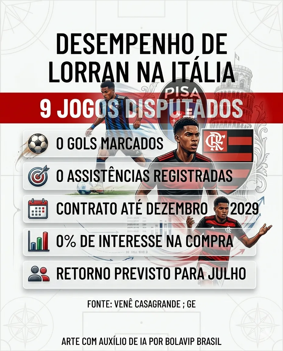 “O Flamengo já sabe que o Pisa não exercerá a compra de Lorran, emprestado ao clube italiano até junho deste ano“, informou Venê Casagrande.