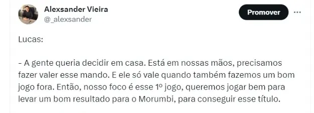 “A gente queria decidir em casa. Está em nossas mãos, precisamos fazer valer esse mando. E ele só vale quando também fazemos um bom jogo fora. Então, nosso foco é esse 1º jogo, queremos jogar bem para levar um bom resultado para o Morumbi, para conseguir esse título”, afirmou o jogador.