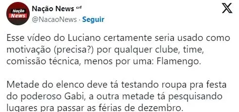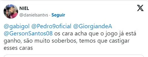 “Até o Luciano sabe que o time do @Flamengo não impõe respeito avisa lá @gabigol, @Pedro9oficial, @filipeluis, @GersonSantos08, @GiorgiandeA, os cara já ganharam só na animação e vcs? Vão entregar mais uma? A Nação não merece vcs brigando com treinador e perder novamente! RAÇA!”, reagiu um torcedor. Outro também marcou jogadores do Flamengo e alertou: “O cara acha que o jogo já está ganho, são muito soberbos, temos que castigar esses caras”.