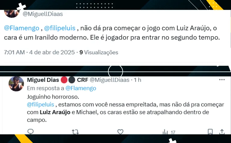 “O curioso caso do jogador do Flamengo que só joga bem quando sai do banco de reservas: prazer, Luiz Araújo!”, escreveu um Rubro-Negro. Isso porque, o atleta não conseguiu ajudar a equipe como esperado e errou bastante durante a partida.