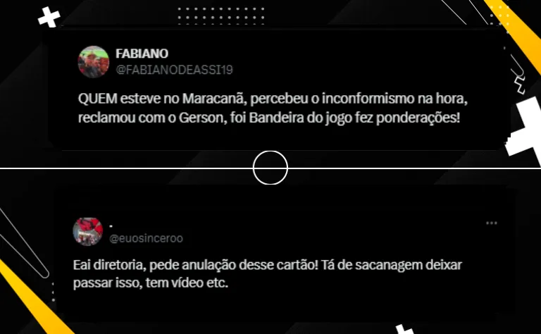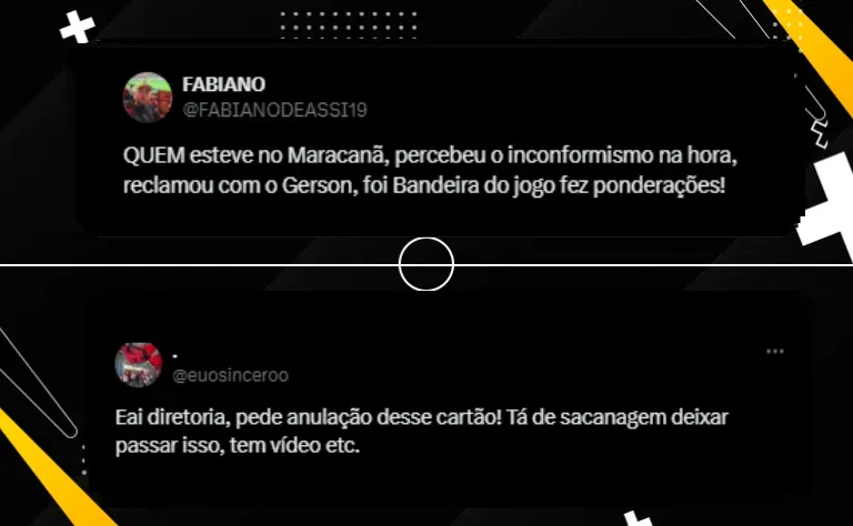 “Inacreditável o cartão amarelo que levei hoje. Vergonhoso”, escreveu o camisa 7. Muitos torcedores flamenguistas também se mostraram muito contrariados com o cartão recebido.