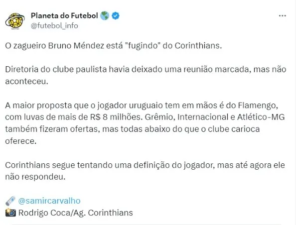 De acordo com Samir Carvalho, o zagueiro Bruno Méndez está “fugindo” do Corinthians. Diretoria do clube paulista havia deixado uma reunião marcada, mas não aconteceu. O time alvinegro segue tentando uma definição do jogador, mas até agora ele não respondeu e su situação segue bem indefinida.