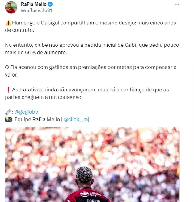 O Fla não aprovou a pedida inicial de Gabi, que pediu pouco mais de 50% de aumento salarial. O Rubro-Negro acenou com gatilhos em premiações por metas para compensar o valor. As negociações ainda não avançaram, mas há otimismo pelo acerto.