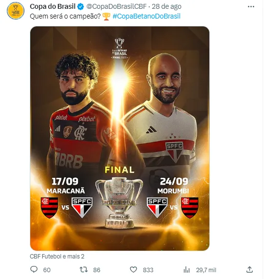 O jogo de ida da final da Copa do Brasil entre Flamengo e São Paulo está marcado para acontecer a partir das 16h (horário de Brasília). O Malvadão terá um desfalque certo: o meio-campista Allan, que ficará fora por dois meses. Ainda não se sabe se Arrascaeta e Luiz Araújo estarão à disposição de Sampaoli na partida.