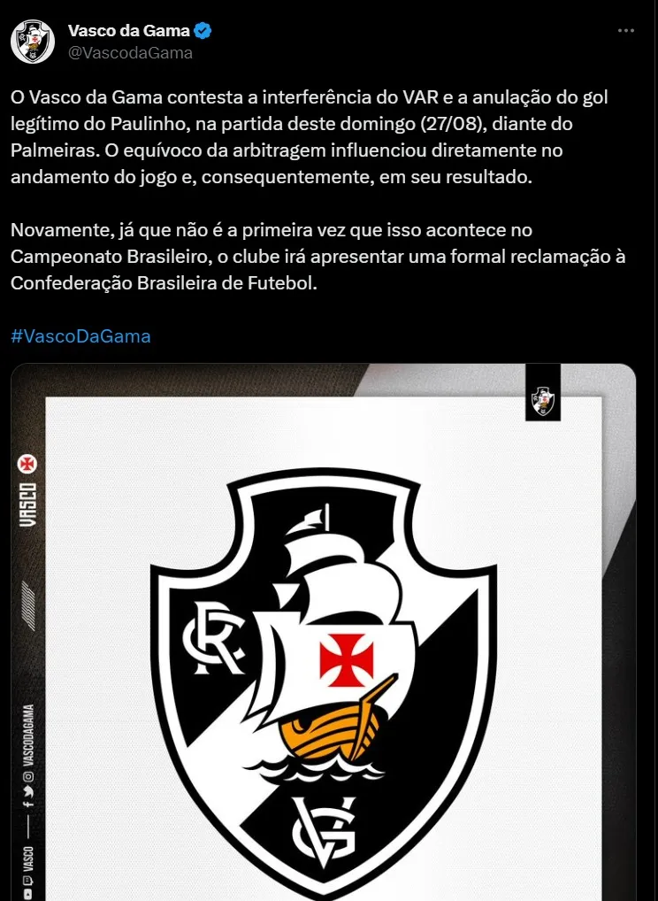 Através de uma nota oficial, o Vasco se manifestou diante do ocorrido, apontando que erros de arbitragem vem prejudicando a equipe no decorrer da temporada. “O Vasco da Gama contesta a interferência do VAR e a anulação do gol legítimo do Paulinho, na partida deste domingo (27/08), diante do Palmeiras. O equívoco da arbitragem influenciou diretamente no andamento do jogo e, consequentemente, em seu resultado. Novamente, já que não é a primeira vez que isso acontece no Campeonato Brasileiro, o clube irá apresentar uma formal reclamação à Confederação Brasileira de Futebol”.